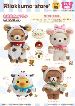 2021年は丑年ウシの顔キラキラうしになりきったリラックマたちのかわいいぬいぐるみや干支デザインアイテムが登場音符手にはソフトクリームやミルク瓶を持っていますソフトクリーム