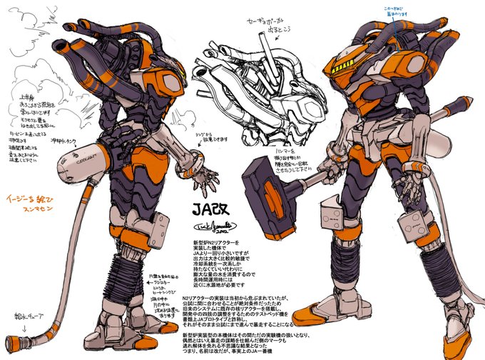 エヴァで戦術核クラス兵器、でも核じゃないノンシュガーなノリのノンニューク→NN爆弾。NNは活舌悪いので二乗でN2にしましょうと提案して通った。貞本さん漫画版にNNが残る。N2リアクターはプレステゲーム用に自分が設定とともにでっち上げたJA改用パワーパックが初出。時は流れヴンダーの補器になった