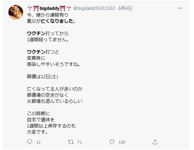 ツイッターを見てると、「知り合いが、ワクチンを打った数日後に亡くなった」 こんな感じのツイートをたくさん見かけました。だから、実際はもっと大勢死んでるはずです。