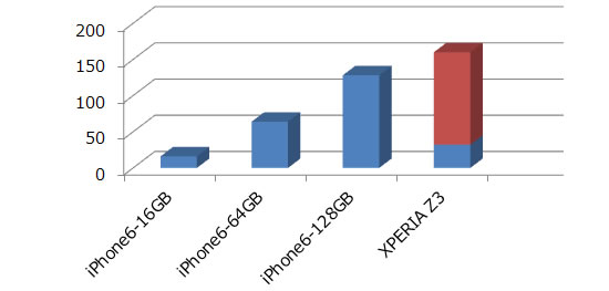 内蔵ストレージは32GBのXPERIA Z3 SOL26ですが、microSDXCを組み合わせればiPhone6 128GBよりも大容量です。